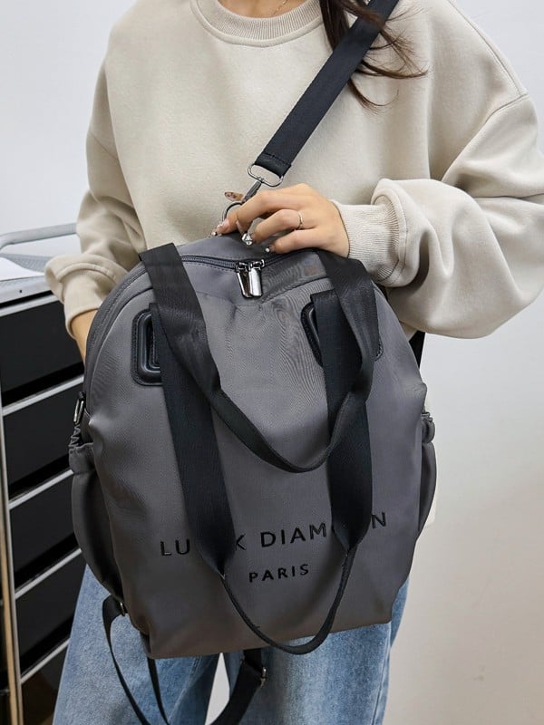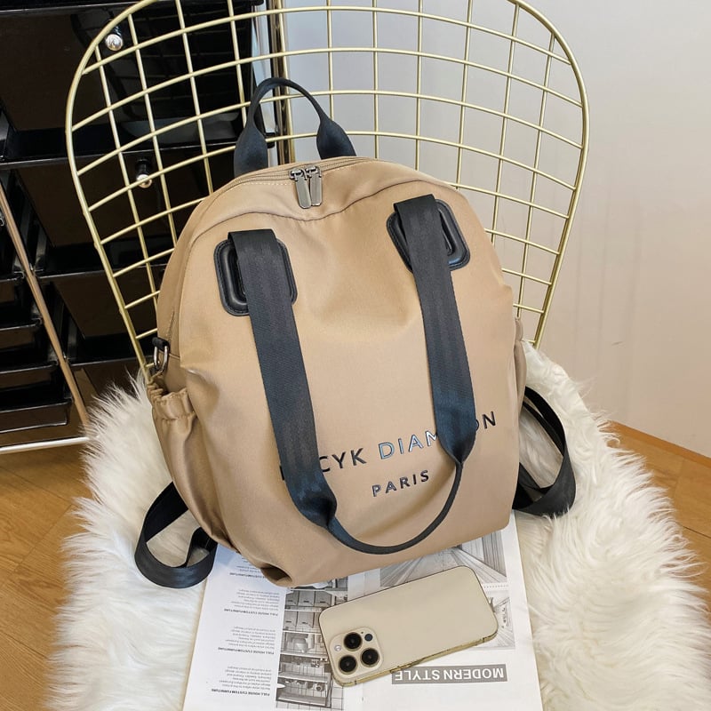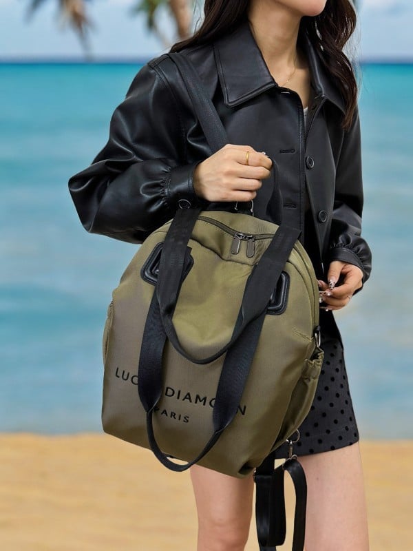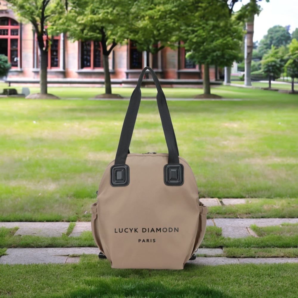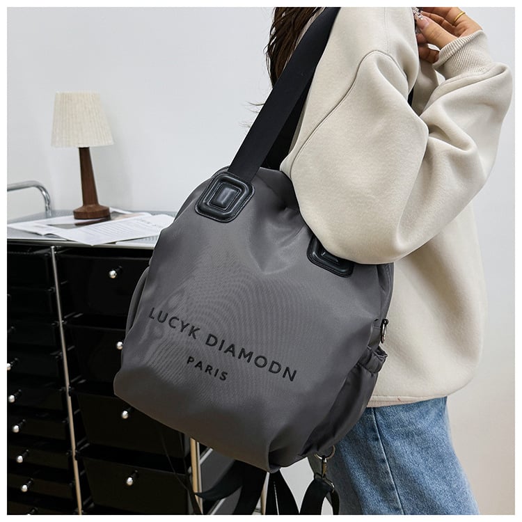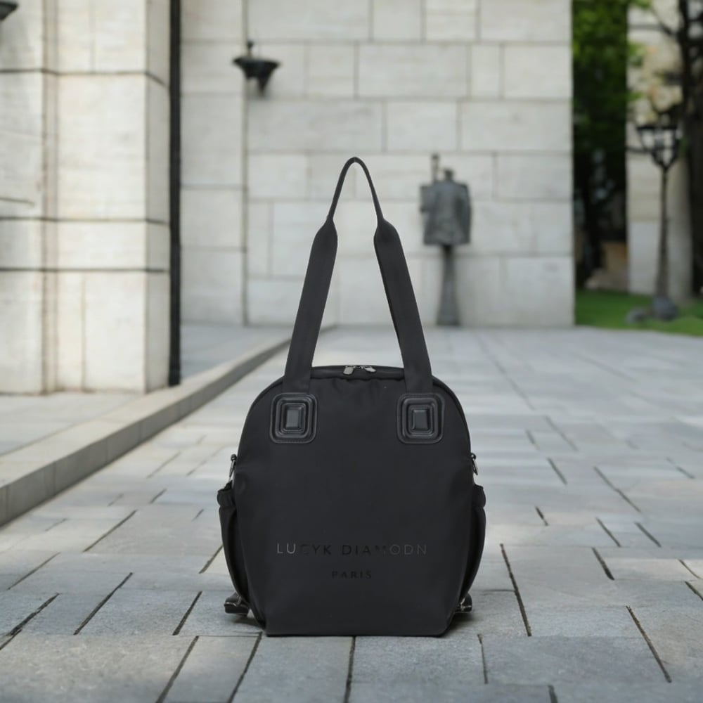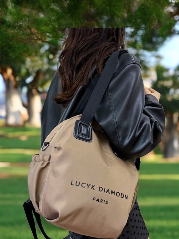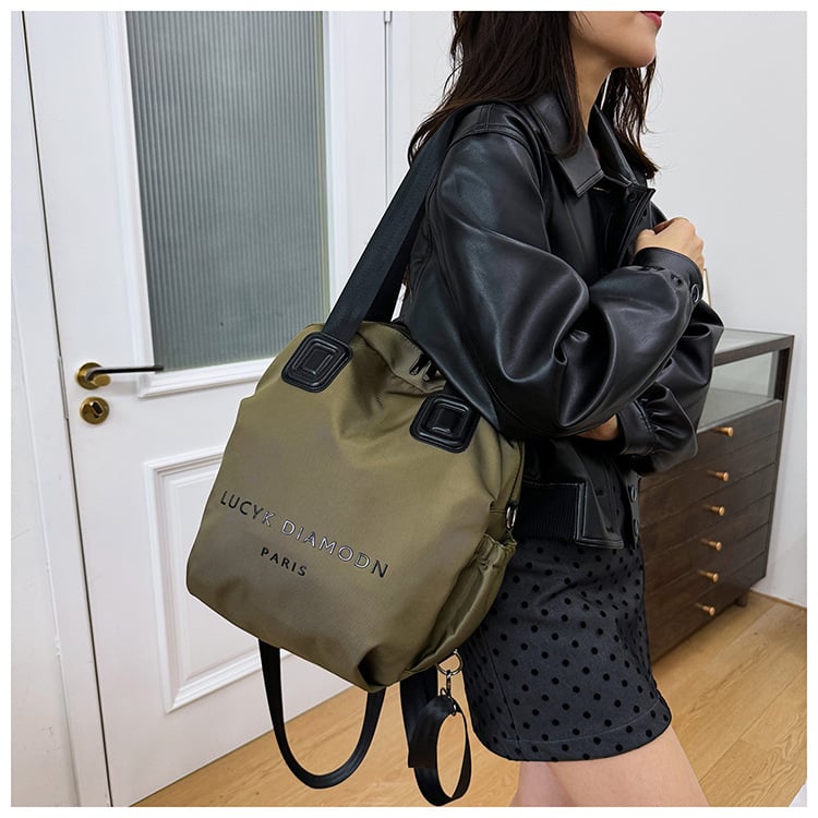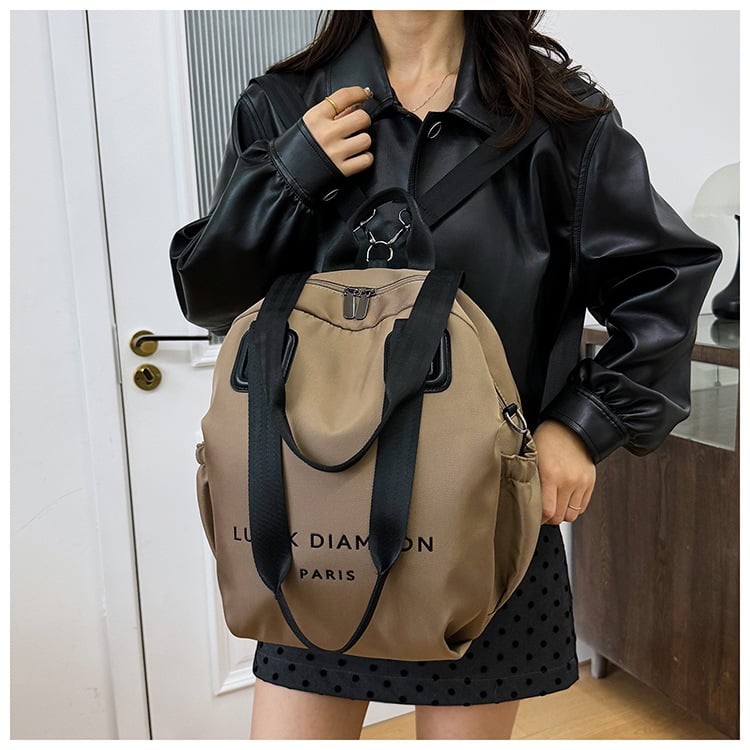 Valmistettu korkealaatuisesta vedenpitävästä nailonista, tämä reppu ei ainoastaan pidä sateen ja roiskeet ulkona, vaan tuntuu myös kevyeltä ja kestävältä. Unohda epämukavat hihnat: joustavat, ergonomiset olkaimet jakavat painon tasaisesti, pitäen sinut mukavana koko päivän. Monikapasiteettisen muotoilun ansiosta tavarasi pysyvät siististi järjestyksessä, jolloin et tuhlaa aikaa etsimiseen. Lisäksi monipuolisten kantovaihtoehtojen (reppu, olkalaukku, ristikkäiskantolaukku, käsilaukku) ansiosta se sopii saumattomasti asuusi ja tilanteeseen. Pienet yksityiskohdat, kuten LUCK DIAMOND PARIS -teksti, lisäävät hienostuneen, urbaanin ilmeen. Tämä ei ole vain laukku; se on huoleton, tyylikäs kumppani kaikkiin päivittäisiin ja yllättäviin seikkailuihin.